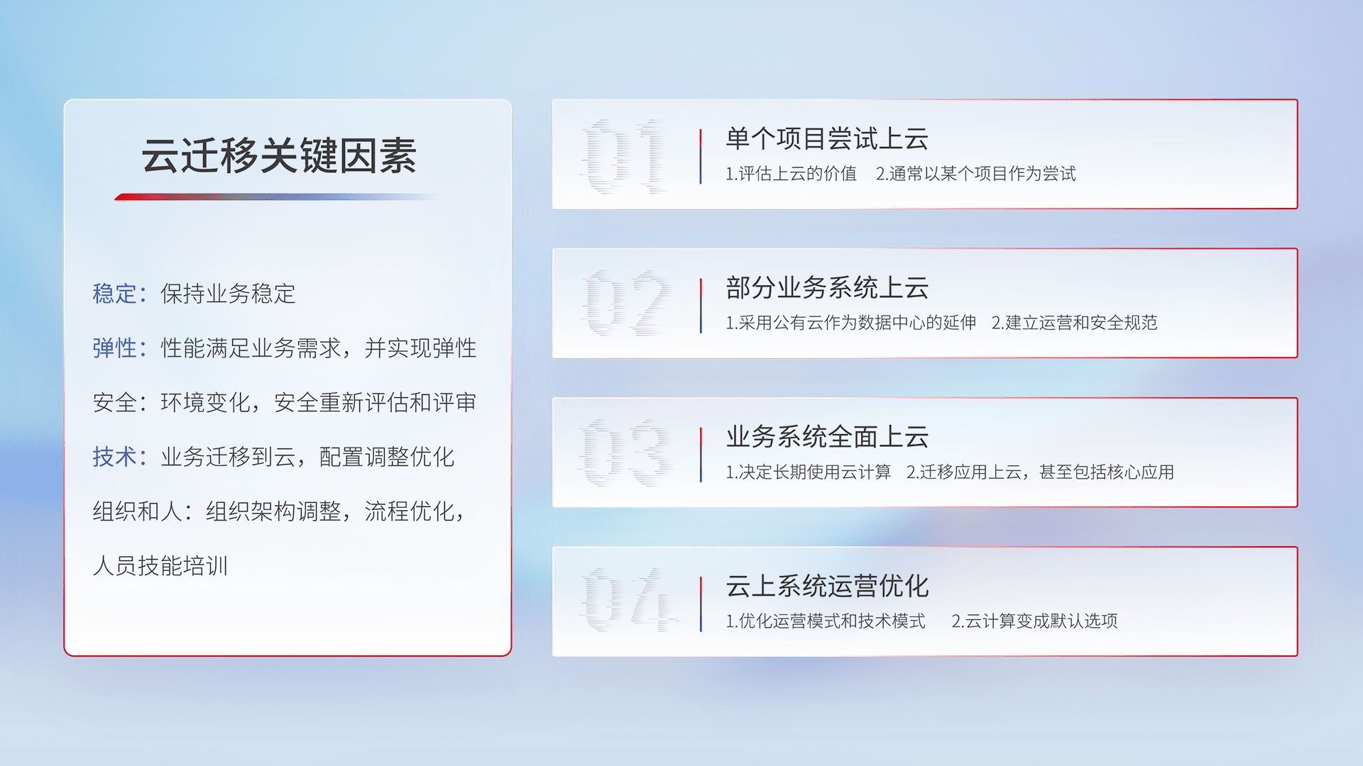 结合实际业务,,从规划设计、、、、云平台选型、、、云原生改造、、、、数据迁移、、、、集成交付,,,,迁移全过程为客户识别最佳上云路径,,,,做好风险识别管理,,,,设计网络架构、、、身份权限、、安全审计合规、、、、操作审计、、、、日志审计、、监控告警策略、、多站点容灾设计等,,,,对云上基础设施进行整体规划,,提升IT治理水平,,,以满足弹性、、、、高可用、、高性能的需求。。。。