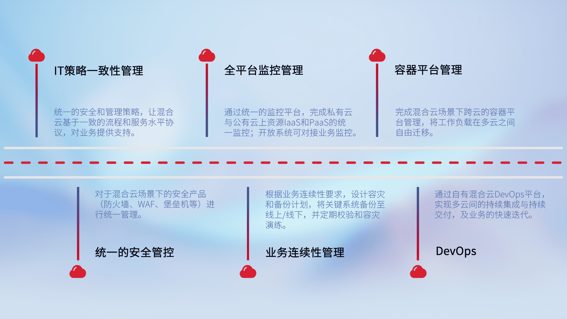 通过多云纳管,,,,以统一的资源数据模型把客户的云资源进行抽象和封装,,,进而实现对多云资源的统一操作,,保障云资源管理的可靠性、、、、稳定性与可用性。。。量身定制化运维内容,,,配置、、开发运维、、、、补丁管理、、备份、、监控、、、、认证和访问管理、、、审计和日常巡检等,,保障在用云过程中的可靠度,,,稳定度以及高可用率。。。。