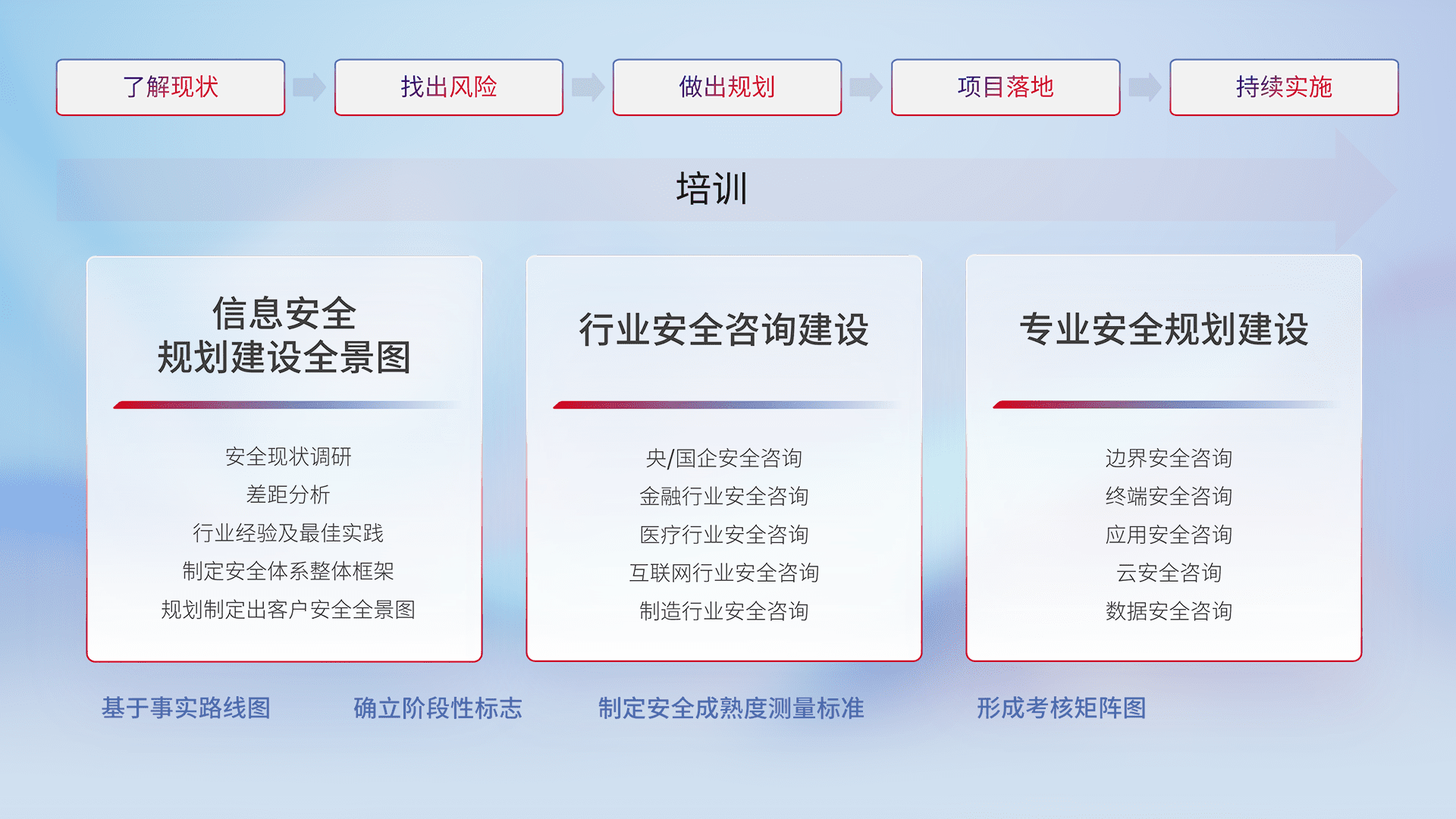 梳理客户信息安全现状调研、、差距分析结果,,结合行业先进经验及最佳实践,,制订客户的信息安全管控体系总结架构,,,最终形成一个完整的客户信息安全规划与建设的全景图。。。