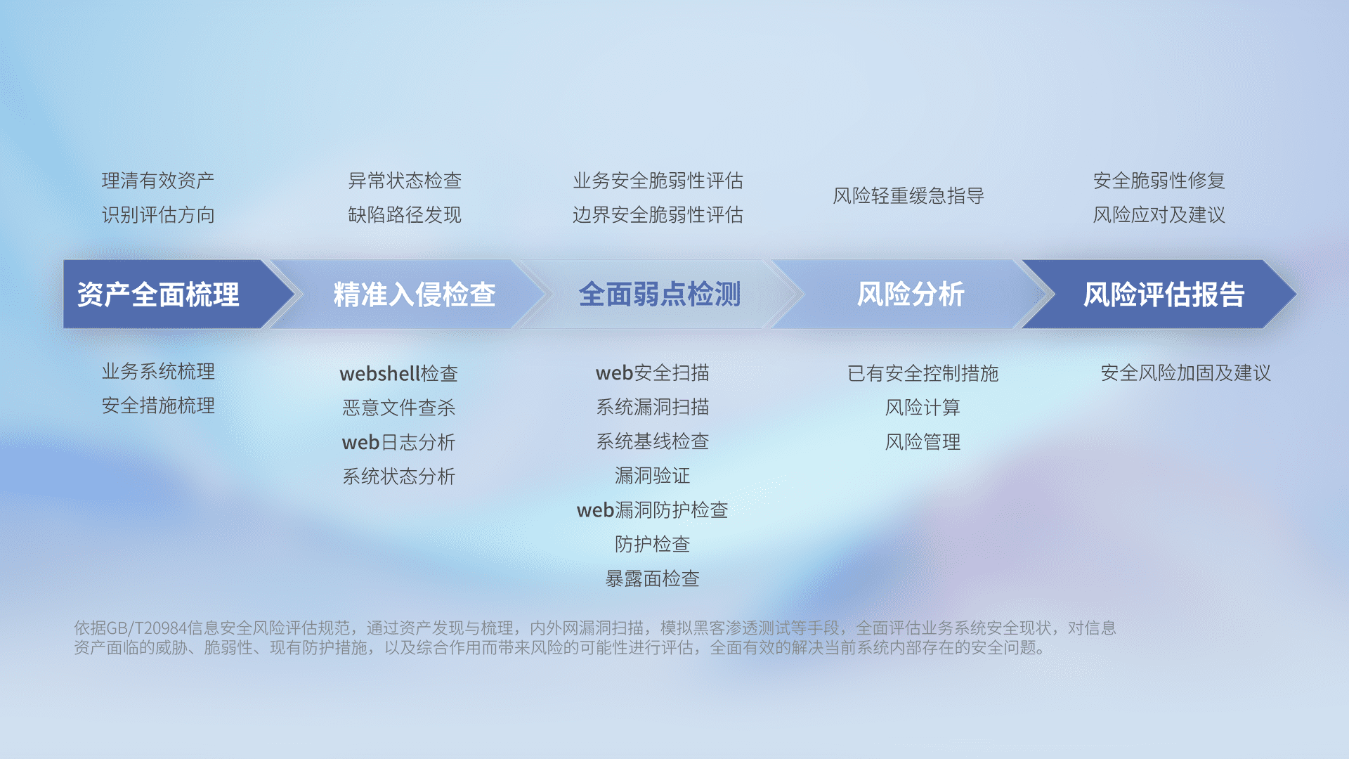 针对客户行业特性,,,,以专业的安全服务+多厂商联合解决方案提供专属的一站式安全管理服务,,,,帮助客户全面感知网络空间威胁,,,,基于识别、、、、检测、、分析、、、防护、、、、监测、、响应的服务理论模型,,,从方案咨询、、集成交付、、、评估验证、、、优化加固、、、运维运营,,,,致力于为客户提供完整的闭环管理式安全服务。。。。以实战经验为客户打造高抵御风险的安全体系,,帮助客户发现威胁、、、对抗威胁、、、、处置威胁,,,,不断积累安全对抗能力,,持续保障数字化安全。。。