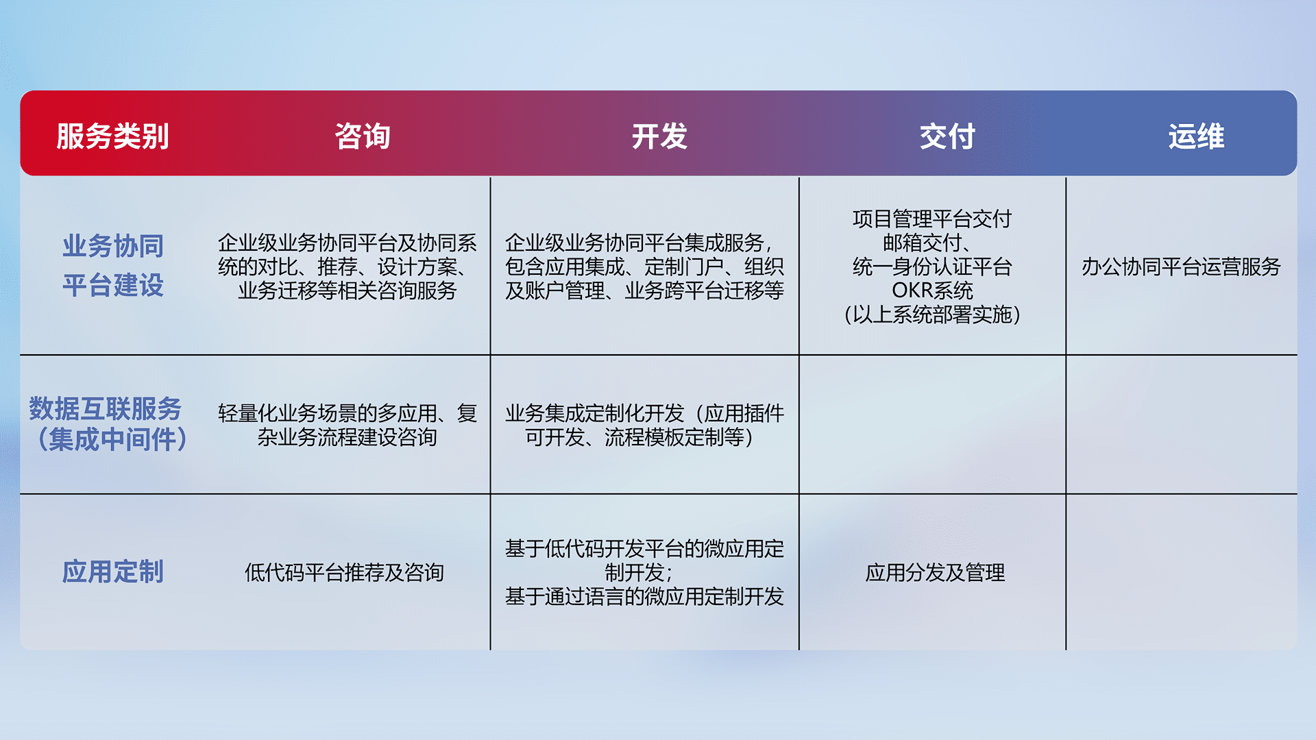 针对钉钉、、、企微、、、、IDaas等平台级产品提供产品的规划、、方案、、、交付、、、定制化开发等服务,,,实现如统一协同办公、、智能客户服务、、、混合会议管理、、智能数据查询、、、等业务场景,,实现数字化转型。。